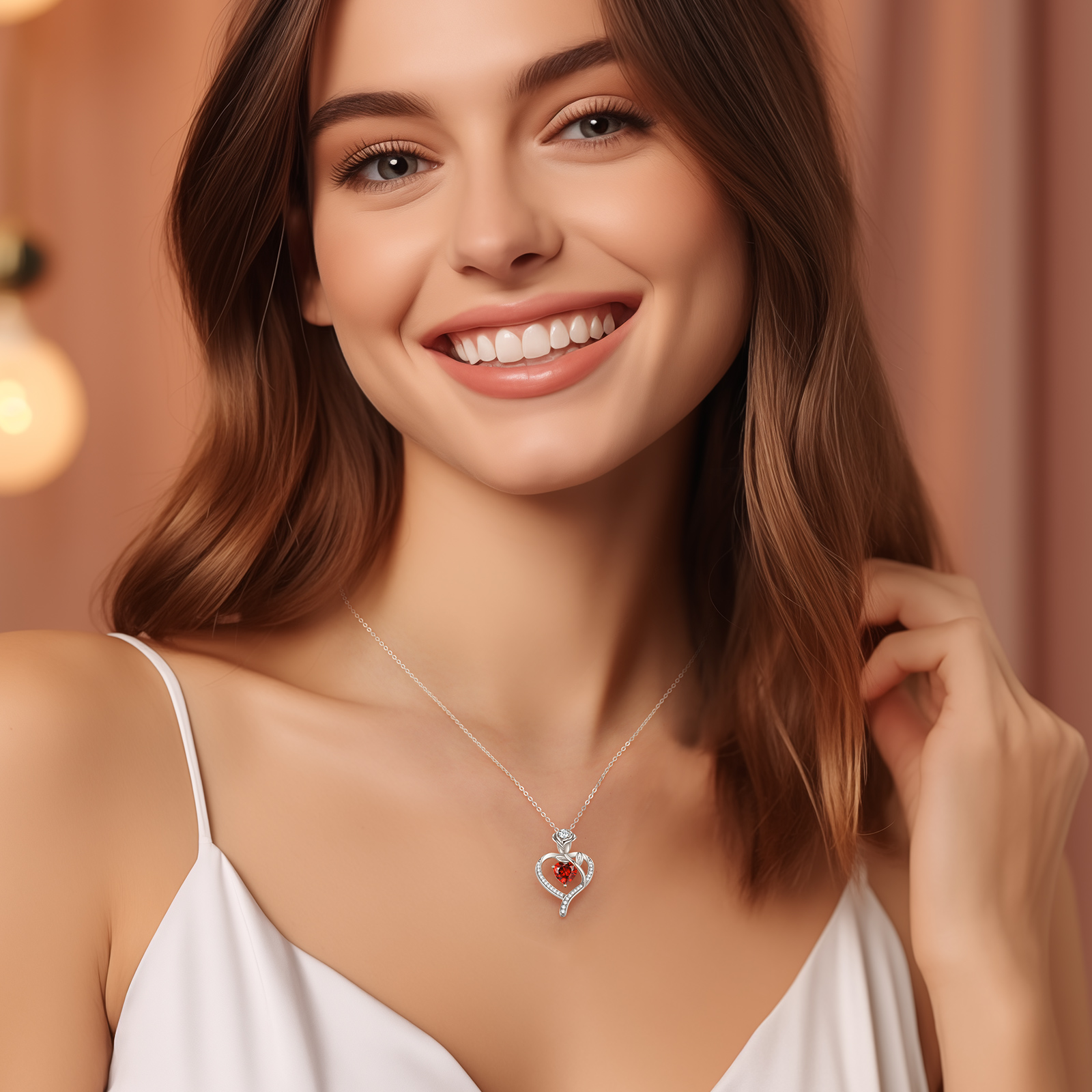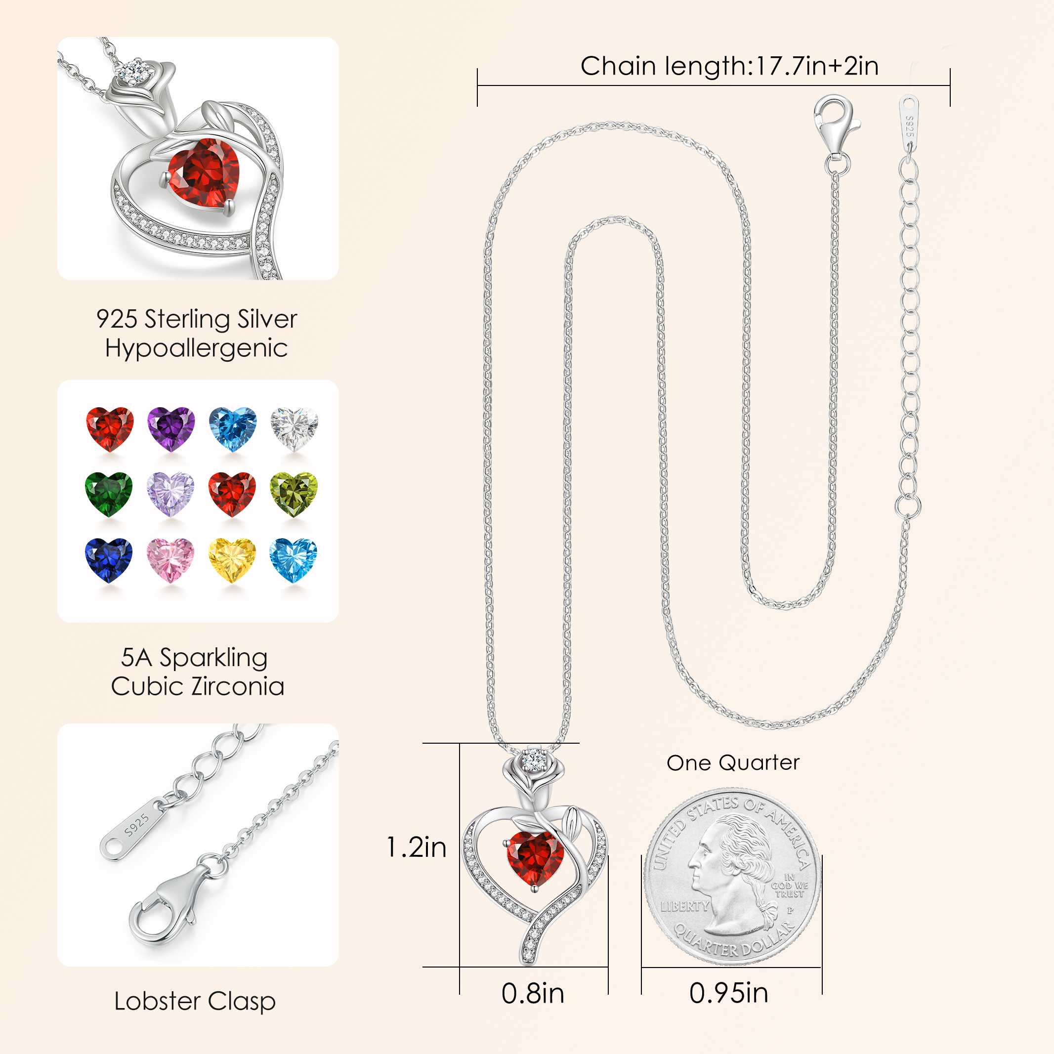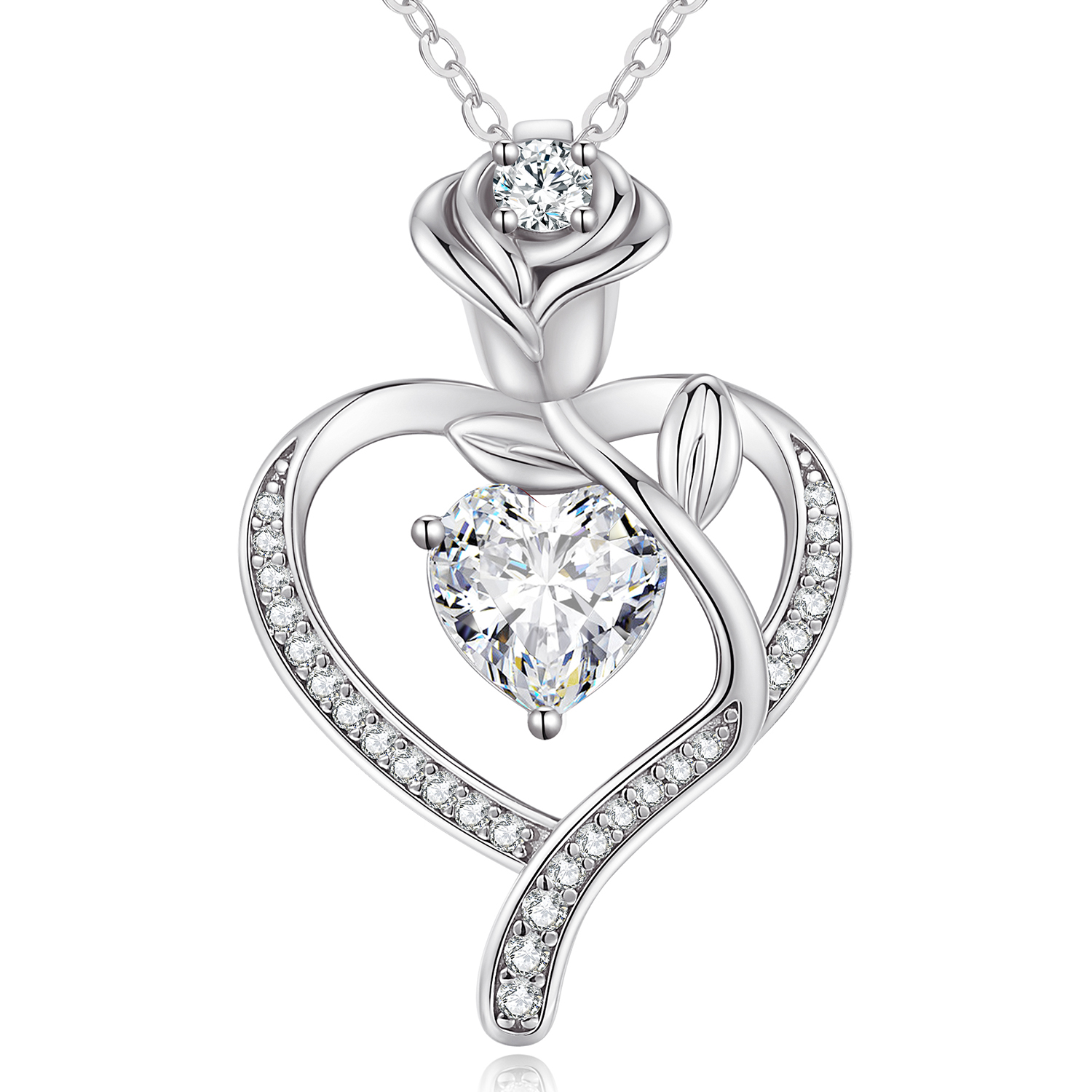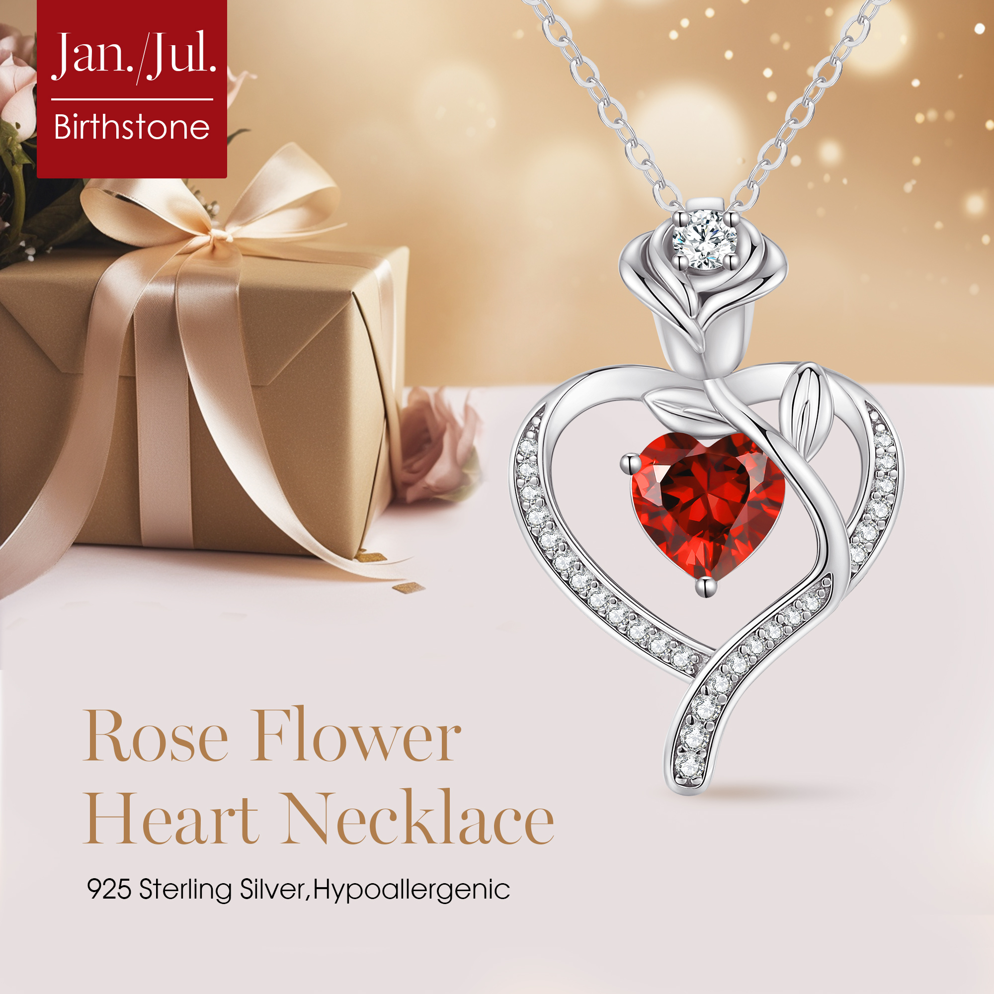 Rose Flower Heart Birthstone Necklaces for Women, 925 Sterling Silver Fine Jewelry, Pendant Heart Necklaces Birthday Anniversary Christmas Gift for Women Wife Mom Girlfriend Lady