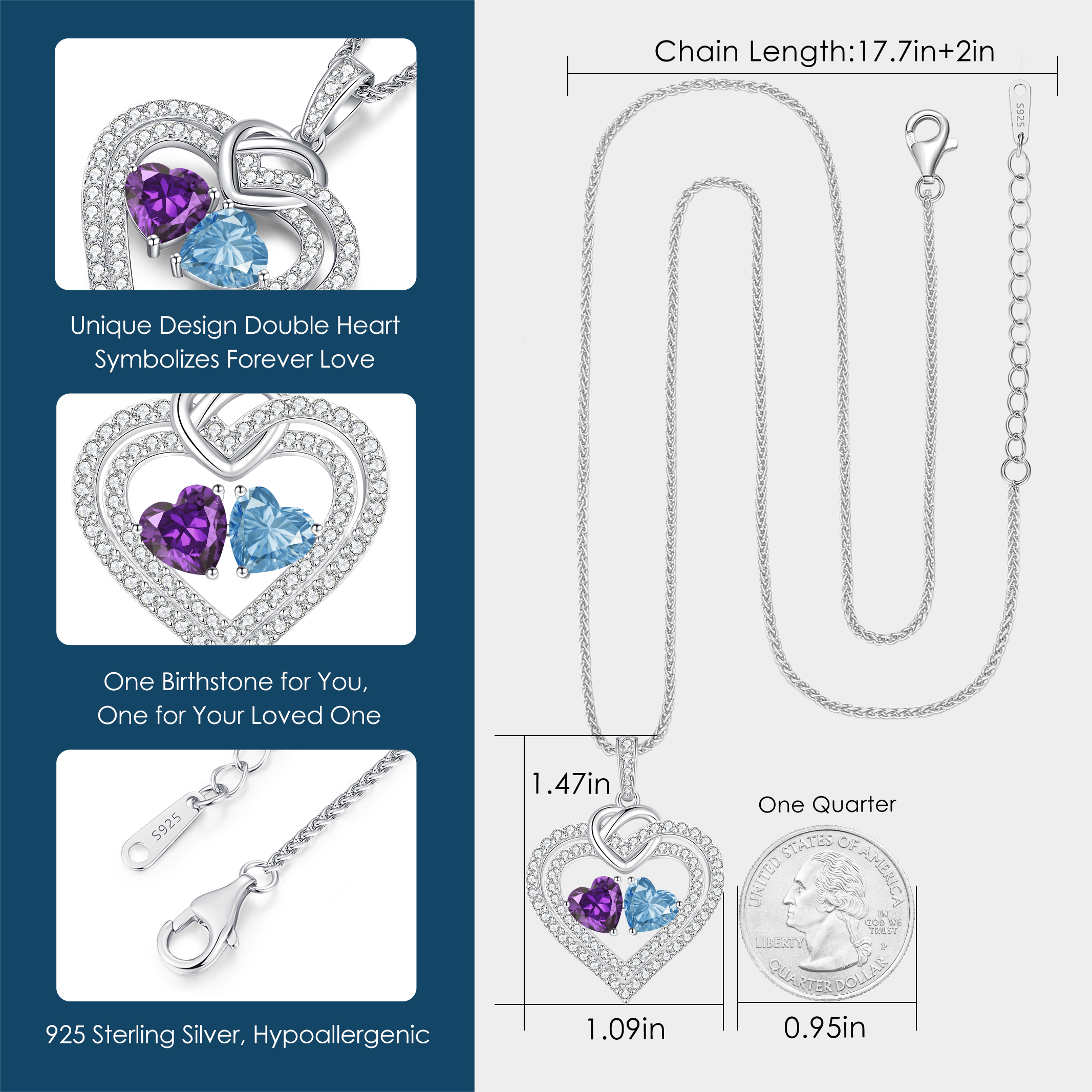 Sparkling Double Heart Birthstone Necklaces for Women, 925 Sterling Silver Fine Jewelry, Pendant Heart Necklaces Birthday Anniversary Christmas Gift for Women Wife Mom Girlfriend Lady