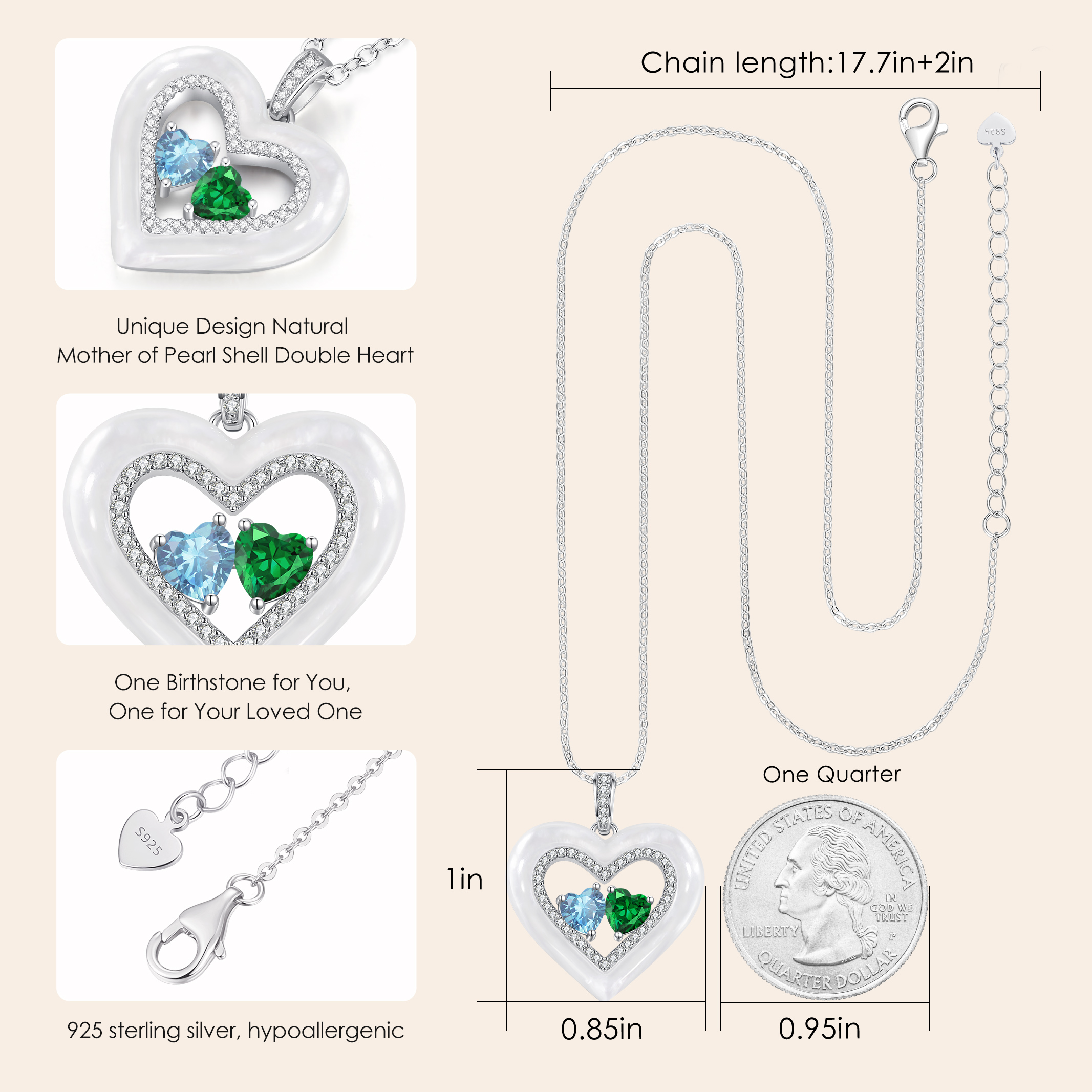 Shell Double Heart Birthstone Necklaces for Women, 925 Sterling Silver Fine Jewelry, Pendant Heart Necklaces Birthday Anniversary Christmas Gift for Women Wife Mom Girlfriend Lady