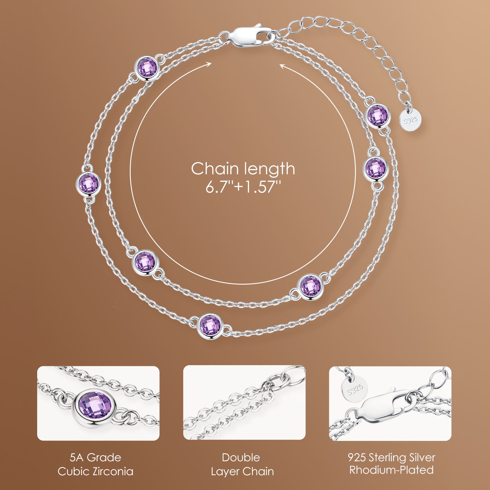 Birthstone Bracelets for Women, 925 Sterling Silver Charm Link Double Strand Bracelet, Birthday Anniversary Christmas Jewelry Gifts for Wife Girlfriend Mother her